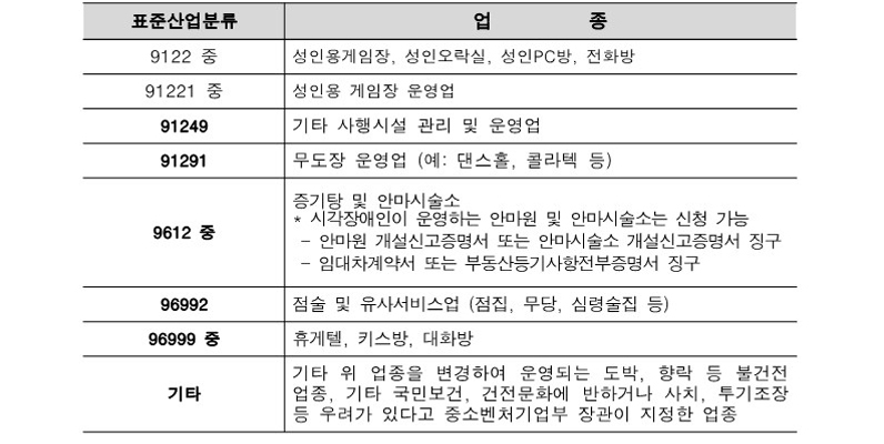 ○ 지원제외: 유흥업소 및 소상공인 정책자금 융자지원 제한업종