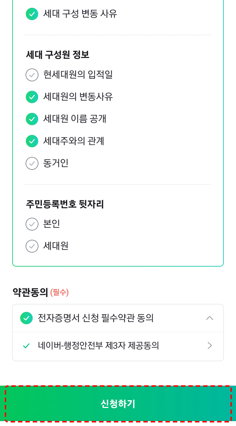 거주지의 시군구를 선택하고 기본발급과 개인정보3가종의 까지 체크하고 신청하기 버튼을 누릅니다. 선택발급은 아래 네이버앱에서 신청시 해보았으니, 선택발급 내용이 궁금하시면 네이버앱 사용신청 내용을 참조하시기 바랍니다