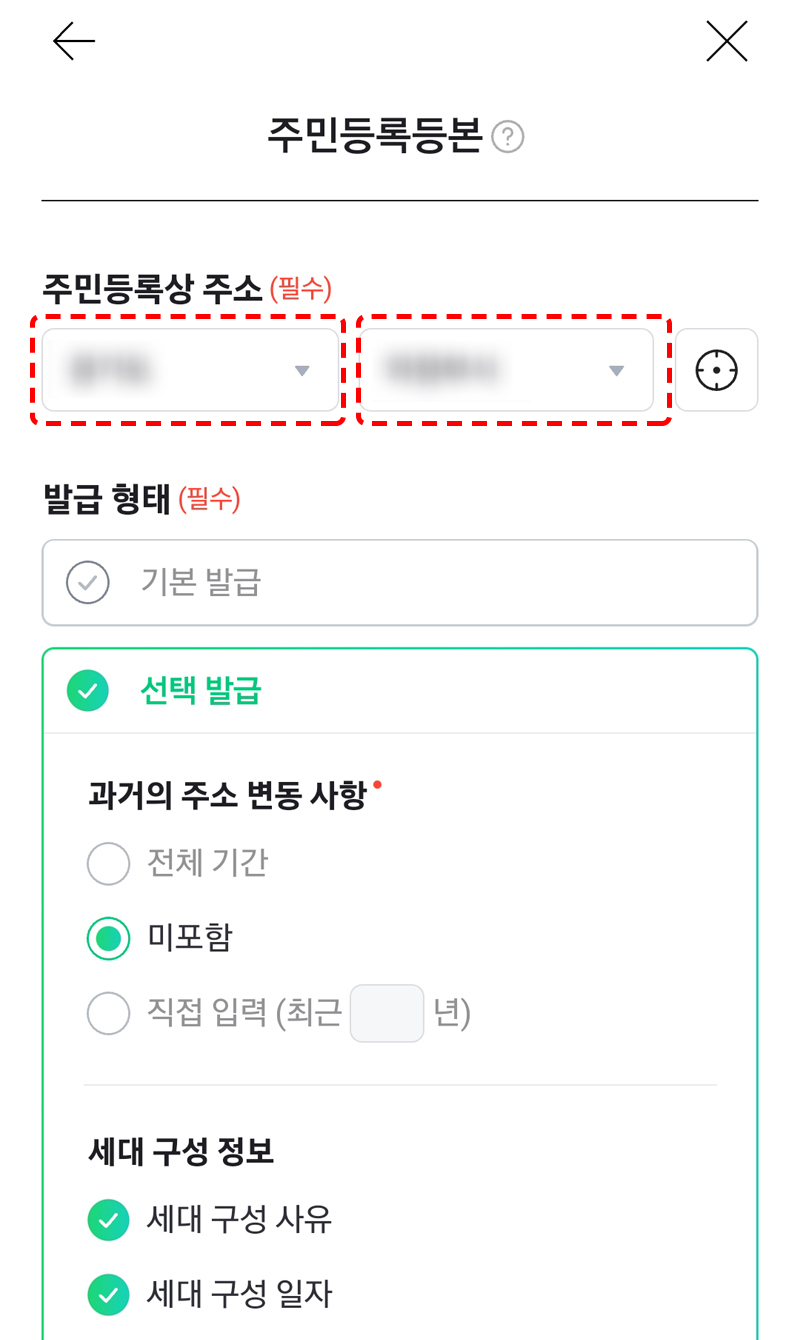 네이버앱에서는 주소지 선택후 선택발급을 선택하여 신청해 보았습니다. 과거 주소변동사항이나 세대원 및 동거인 선택, 주민번호 뒷자리 표시여부 등을 선택할 수 있습니다. 굳이 요구하지 않은 정보를 보이기 싫을 때는 적절히 활용하여 발급신청하는 것도 좋을 것 같습니다.