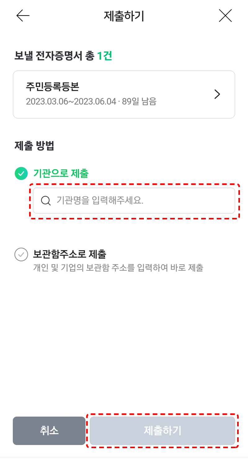 바로 제출을 원하는 경우 '②제출' 버튼 클릭후 원하는 기관이나 기업을 검색하여 선택하고 나서 제출하기 버튼을 누르면 제출까지 마무리됩니다.
