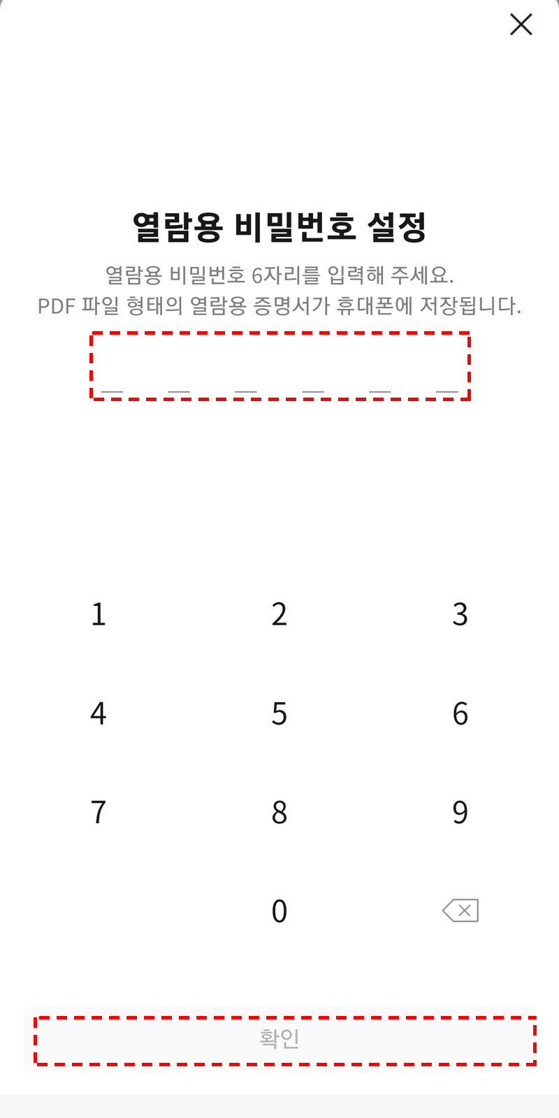 인증 확인후에는 저장되는 PDF파일을 열 때 시용할 비밀번호를 입력해야 합니다. 6자리 숫자를 꼭 기억하시고 설정할 비밀번호를 입력하고 확인을 눌러줍니다.