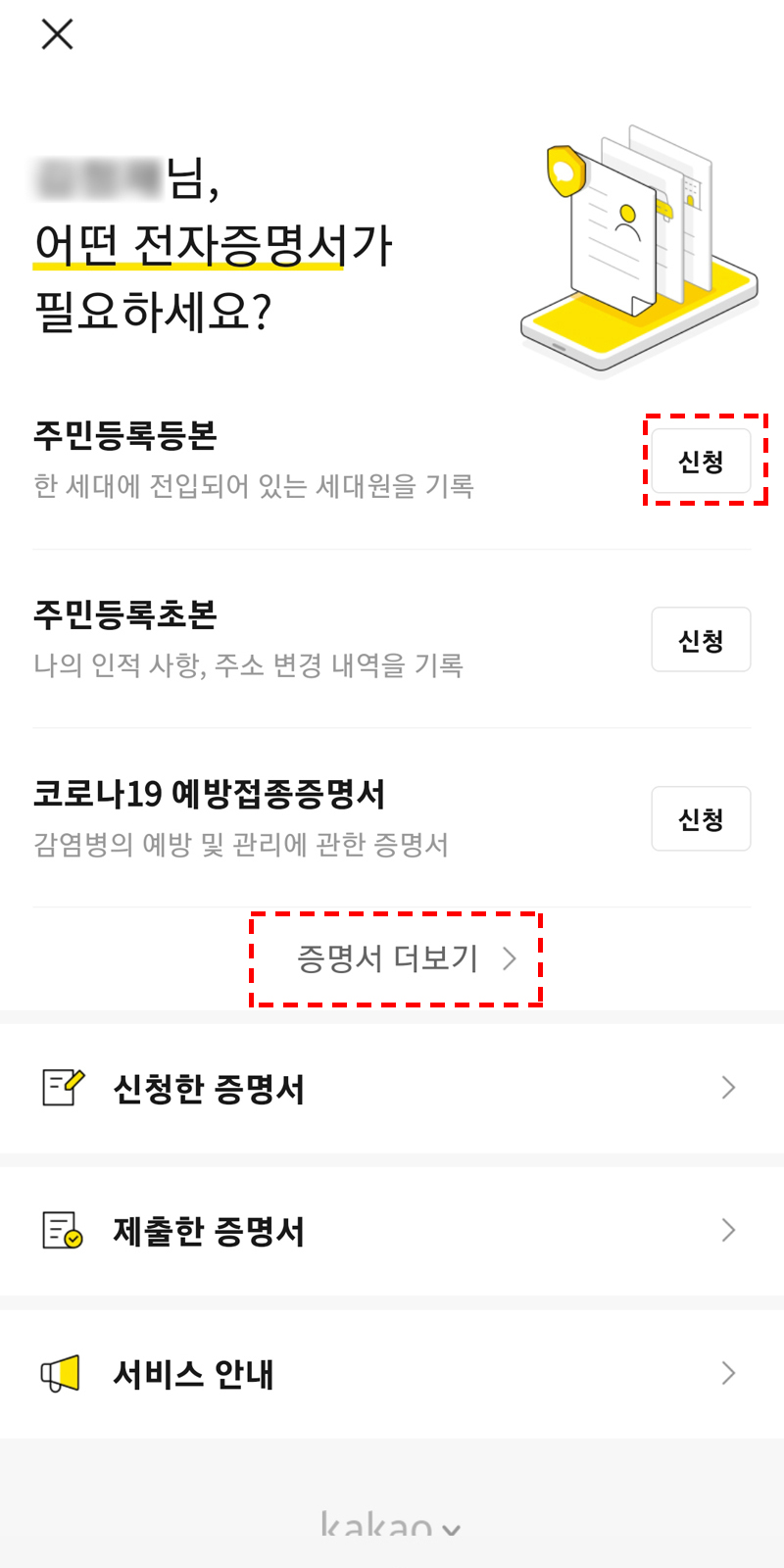 카톡 전자증명서 창 중간의 '증명서더보기' 를 클릭하면 주민등록등본 외에도 주민등록초본에서부터 대학교 성적증명서까지 여러 종류의 증명서의 신청이 가능합니다. 주민등록등본 외에 추가로 필요한 서류 있다면 신청하시면 됩니다.