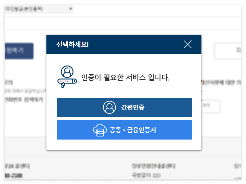 인증창이 뜨면 신청자가 사용편리한 간편 인증이나 공동. 금융인증서를 선택하여 신청합니다. 이번에는 간편 인증을 클릭하고 카카오 간편 인증을 사용하여 신청해 보았습니다.